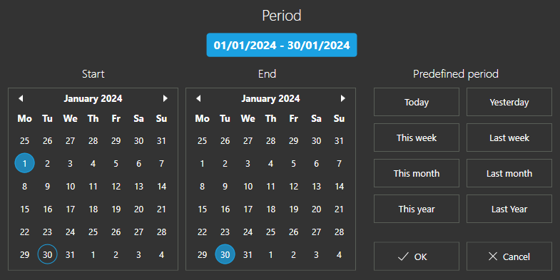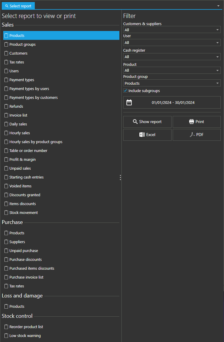 | Products Product groups Customers Tax rates Users Payment types Payment types by users Payment types by customers Refunds Invoice list Daily sales Hourly sales Hourly sales by product groups Table or order number Profit & margin Unpaid sales Starting cash entries Voided items Discounts granted Items discounts Stock movement |